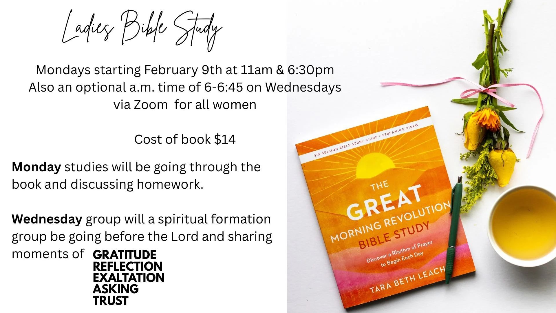 This Wednesday morning group is for any woman interested. You do not have to be part of the Monday morning or evening study to participate. We will be doing some spiritual practices as mentioned in the graphic below … Gratitude … Reflection … Exaltation … Asking … Trust.